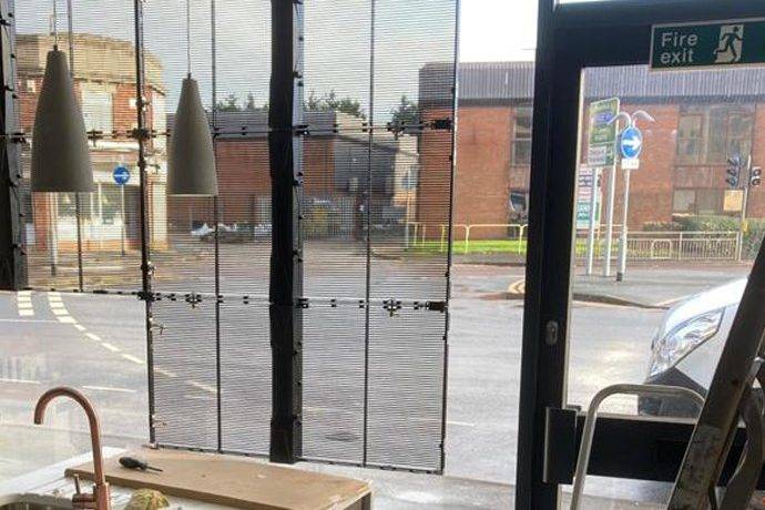 Project name:P3.91-7.82 Indoor High Brightness Transparent LED Wall in UK Product Model:P3.91-7.82 Screen size:2×1.5M Location:UK Time:2020 Application:Shop Window Advertisement, Shopping Mall Advertising