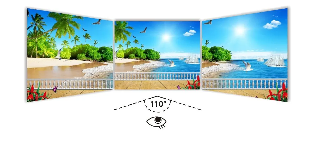 Viewing angle is up to 110° vertical and horizontal, providing a wide viewing angle.
